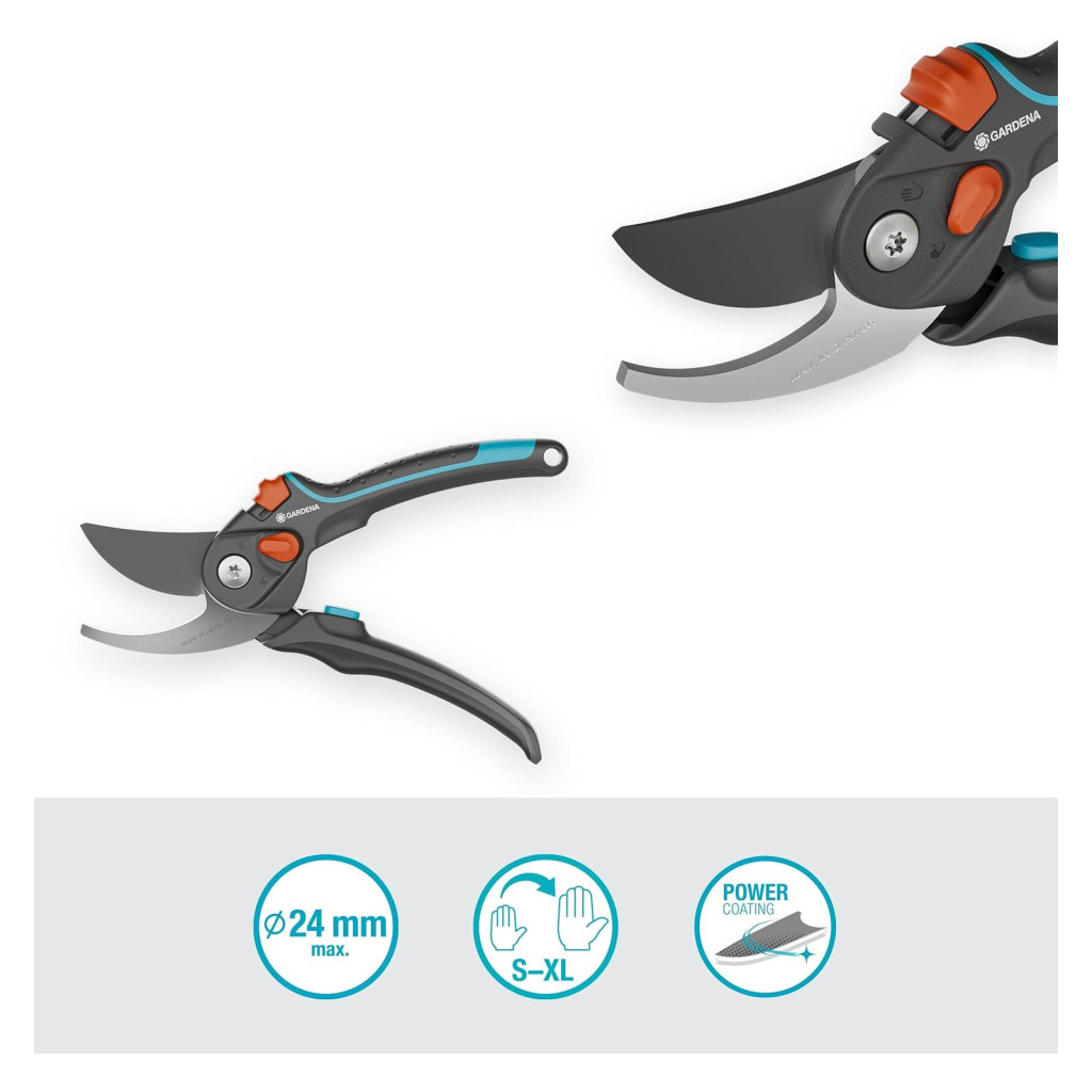 Kiemelkedő vágóerő: GARDENA PremiumCut Pro Flex metszőolló a könnyed metszéshez. Nagy teljesítmény – könnyű kezelhetőség. A GARDENA PremiumCut Pro Flex metszőolló okosan megoldja a könnyed vágást, ötvözi a kategória legjobb teljesítményét, a prémium megjelenést, a kényelmet és a biztonsági funkciókat, mint a változtatható nyílásszögű markolatot, a beépített rugós nyelet, a 2K puha elemű markolatot, az ütközéscsillapítót, a nedvhoronyt és a drótvágót, valamint a GARDENA jellegzetes bevonatát. A praktikus és hordozható prémium metszőolló nagy vágóerőt kínál egy könnyű és kényelmes csomagolásban. A GARDENA ergonomikus, puha, 2 nyélpozíciós markolatkialakítása a felhasználó kényelmét szolgálja, minimálisra csökkentve a kéz terhelését a fáradságmentes metszés érdekében. A két nyélpozíció minden kézméret számára kényelmes, az üvegszál-erősítésű markolatok pedig >40%-ban újrahasznosított műanyagból készülnek. A GARDENA PremiumCut Pro Flex metszőolló erőteljesen vágja még a legmakacsabb száraz gallyakat és ágakat is. Az éles, precíziósan csiszolt pengék vágási átmérője 24 mm, és a GARDENA bevonattal rendelkeznek az egészséges növények, a könnyű tisztítás és a tartós védelem érdekében. Ezek a kések kiváló minőségű acélból készültek a könnyed vágásért, drótvágóval és beépített rugós markolattal. Ez a PremiumCut Pro Flex metszőolló Németországban készül a GARDENA szigorú szabványai szerint. Úgy tervezték, hogy sokáig hatékonyan vágjon hosszú, gondtalan élettartam mellett, amelyet a 25 év kiterjesztett szavatosság garantál. A metszőolló a markolatánál fogva felakasztható; tárolása könnyű és kényelmes. A bevonatos kések egykezes biztonsági zárral rendelkeznek, amely használaton kívül egyszerűen zárt helyzetbe rögzíti a késeket, így egyszerűen biztonságos és kényelmes.