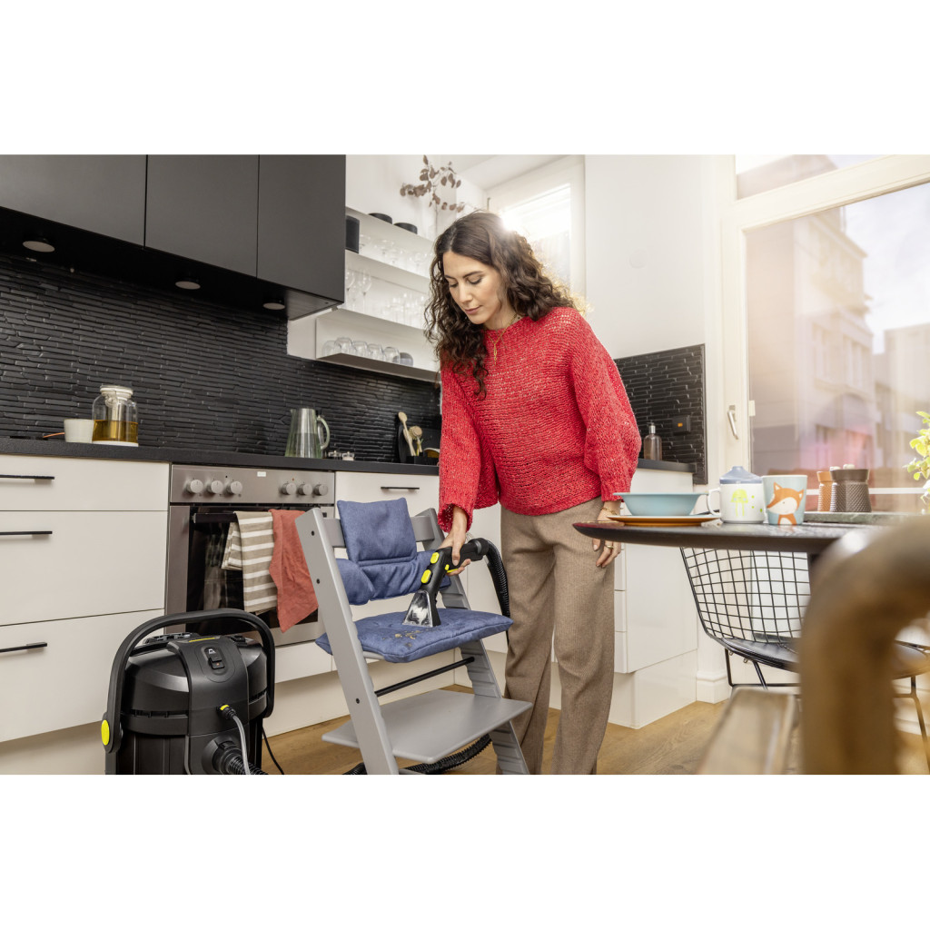 A Kärcher SE 4 Go!Further kárpittisztító egy limitált fekete kiadású gép, amely 25% újrahasznosított műanyagból készült, és olyan exkluzív tartozékokkal rendelkezik, mint például a kisállatszőr eltávolítására szolgáló kárpittisztító fej. A Kärcher SE 4 Go!Further limitált, fekete kiadású kárpittisztító 25%-ban újrahasznosított műanyagból készült, és exkluzív tartozékaival kiemelkedő kényelmet és tisztítási eredményt nyújt. A mutatós, szánkó kialakítású készülék szálmélységig hatoló, higiénikus tisztaságot biztosít számos textilfelületen a Kärcher bevált permetextrakciós technológiájával: a friss vizet és az RM 519 tisztítószert nyomás alatt mélyen a szálak közé permetezi, majd a feloldott szennyeződéssel együtt azonnal vissza is szívja. Ez a megoldás ideális családok, allergiások és kisállatot tartók számára is. Az SE 4 Go!Further egy multifunkcionális, 3 az 1-ben termék, amely teljes értékű száraz-nedves porszívóként is funkcionál. A nagy méretű, áttetsző, 4 literes frissvíz-tartály ütésálló és levehető, így megtöltése és ürítése rendkívül egyszerű. A speciális 3 az 1-ben hordozófogantyú megkönnyíti a tartály szállítását, nyitását és zárását, a tartozékok pedig rendezetten, közvetlenül a készüléken tárolhatók. A hosszú élettartam érdekében a gép a használat után könnyen tisztítható.