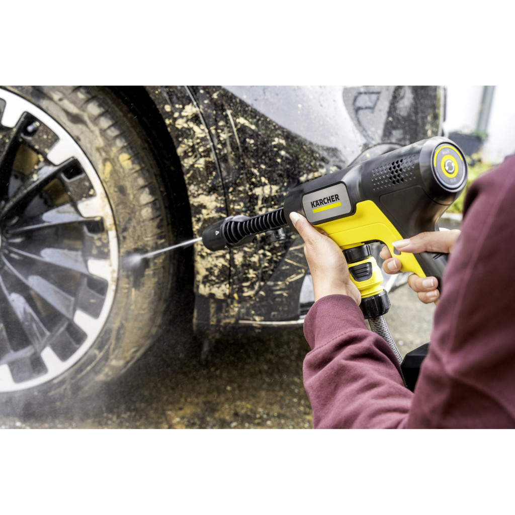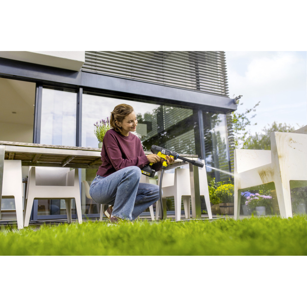 A mellékelt szívótömlővel és a Kärcher 18 V-os cserélhető akkumulátorával a tisztítás útközben vagy a ház körül is egyszerű és mobil – víz- és áramforrástól függetlenül. Rugalmasan használható számos különböző tisztítási feladathoz, például kerékpárokhoz, kerti és kempingfelszerelésekhez, babakocsikhoz vagy az autó pontszerű tisztításához. A vízellátás biztosítható csatlakoztatott kerti tömlőn keresztül, vagy a szívótömlő segítségével külső vízforrásokból.