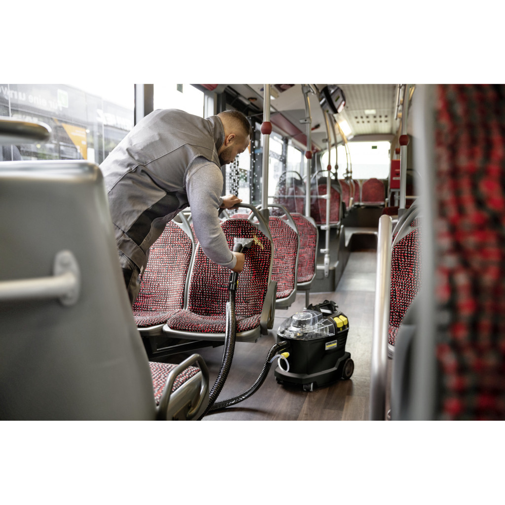 A Kärcher Puzzi 8/1 Go!Further permetextrakciós tisztítógép. Ez a különleges, fekete színű limitált kiadás a fenntarthatóság és a professzionális teljesítmény ötvözete, amely 44%-ban újrahasznosított műanyagból készül. A Kärcher Puzzi 8/1 Go!Further permetextrakciós tisztítógép. Ez az exkluzív, fekete színű limitált kiadás a professzionális hatékonyságot fenntartható gyártástechnológiával ötvözi, hiszen háza 44%-ban újrahasznosított műanyagból készül. A gép legfőbb technikai előnye a kimagasló költséghatékonyság és a higiénikus tisztítási teljesítmény: a tisztítóoldatot mélyen a szálak közé juttatja, majd az erős szívókapacitás révén a feloldott szennyeződéssel együtt távolítja el, minimális maradéknedvességet és gyors száradást biztosítva. Az alapfelszereltség részét képezi egy extra rövid kárpittisztító fej a szűk helyek eléréséhez, valamint egy 1 literes RM 764N OA tisztítószer. Csekély súlya, ergonomikus hordozófogantyúja, valamint a folyamatos vizuális kontrollt biztosító transzparens fedél és fúvóka teszik ezt a környezettudatos modellt ideális választássá az autókozmetikák és a vendéglátóipar számára.
